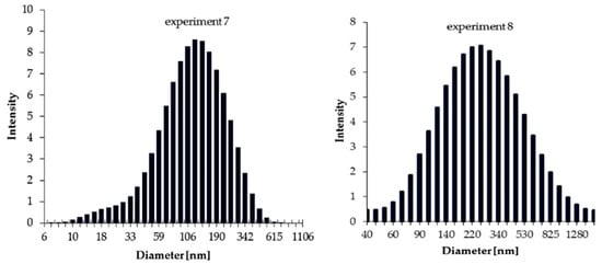 Hydrodynamic diameter of silver nanoparticles, stabilized with 16-6-16 from synthetic procedure with excess of reductor, are 110 and 220 nm for experiments 7 and 8, respectively. These results clearly show that synthetic procedure applied in experiment 7 gives the smallest AgNPs with the best stabilizing effect of gemini bilayer. Figure 8 represents the particle size distribution histograms of AgNPs synthesized in the experiments 7 and 8.