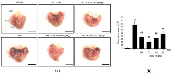 Macroscopic effect of BOE on H/E-mediated gastric damage. (a) Representative gross stomach images. Scale bars indicate 6.5 mm. (b) Macroscopically visible lesion on the gastric mucosa was quantified as a gross lesion area (mm2). Numerical results are presented as mean ± SD of ten mice (** p < 0.01 between the vehicle and H/E groups; ## p < 0.01 versus H/E-administered group). BOE, B. oleracea var. capitata L. extract; Car., cardiac region of the stomach; Fun., fundus/corpus region of the stomach; H/E, HCl/ethanol; Pyl., pylorus region of the stomach; RA, ranitidine hydrochloride.