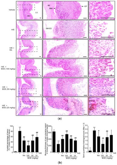 Next, the gastric tissue was stained with hematoxylin and eosin to explore the pathological changes more in depth. Results from hematoxylin and eosin staining of the gastric tissue revealed that H/E provoked severe ulcerative lesions, which included focal extensive superficial epithelial damage, desquamation of focal epithelium, edema of submucosa, congestion and hemorrhage, infiltration of inflammatory cells, and necrosis of gastric glands. Pre-administration of BOE or RA significantly attenuated those microscopic ulcerative changes induced by H/E (Figure 3a). Especially, histomorphometric analysis indicated that H/E administration significantly increased the semi-quantitative histological score (Figure 3b, right) as a result of an increase in invaded percentage of lesion in the fundus/corpus regions (Figure 3b, left) as well as reduction in mucosal thickness in the peri-ulcerative region (Figure 3b, middle). These H/E-mediated histopathological changes were significantly alleviated by the administration of 25–100 mg/kg BOE, except for semi-quantitative histological score, which did not differ between the H/E + BOE (25 mg/kg) group and the H/E group. RA administration also significantly prevented the H/E-mediated histopathological changes in the gastric tissue. When the preventive effect of BOE was compared to RA, 100 mg/kg BOE yielded a greater reduction in H/E-mediated histomorphometric changes relative to RA (p < 0.0.5 in invaded percentage of lesion; p < 0.01 in mucosa thickness; p < 0.01 in semi-quantitative histological score). However, the preventive effects by 25 and 50 mg/kg BOE did not differ from those by RA.