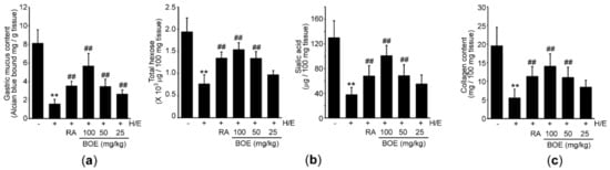 To explore the effect of BOE on integrity of the gastric mucus, we determined the mucus content via Alcian blue binding assay. In parallel with results from histopathology, pre-administration of BOE significantly attenuated H/E-mediated loss of gastric mucus in a dosage-dependent manner (Figure 4a). RA also significantly prevented the mucus loss, and its effect did not differ from that seen in response to 50 mg/kg BOE. Next, we quantified the level of carbohydrates in the gastric mucus. Compared to the vehicle, H/E significantly decreased the levels of total hexose and sialic acid, suggesting that H/E damages glycoprotein in the gastric mucus. By contrast, 50–100 mg/kg BOE as well as RA significantly blocked the decreases in the level of total hexose and sialic acid. However, the carbohydrate levels by 25 mg/kg BOE did not differ from those by H/E (Figure 4b). Compared between H/E + BOE and H/E + RA group, the magnitude of the sialic acid’s restoration by 100 mg/kg BOE was only greater than that by RA (p < 0.01). In addition, 50–100 mg/kg BOE and RA significantly prevented the H/E-mediated decrease in collagen (Figure 4c), which is a representative structural protein found in the extracellular matrix [27]. There were no statistical differences in collagen content between the group treated with three different doses of BOE and RA.