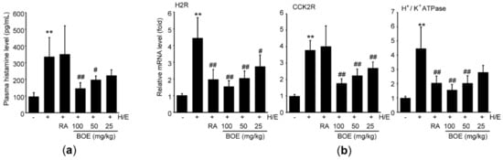 Because it has been reported that ethanol decreases gastric pH in experimental animals [28], we further explored the effect of BOE on the major regulating factors for secreting gastric acid. Compared to vehicle, H/E significantly increased plasma level of histamine. Although pre-administration of RA did not attenuate H/E-mediated increase in plasma histamine, 50–100 mg/kg BOE significantly decreased plasma histamine level, relative to H/E group (Figure 5a), and the magnitude of the reduction in histamine level by 100 mg/kg BOE was greater than that by RA (p < 0.05). Real-time PCR analysis was conducted to assess the effects of BOE on major responsible genes for secreting gastric acid. In parallel with the result from plasma histamine, H/E significantly induced mRNA expression levels of H2R, CCK2R, and H+/K+ ATPase. However, H/E-mediated increases in those mRNAs were significantly inhibited by the three different doses of BOE, except for H+/K+ ATPase mRNA, which did not differ significantly between H/E and H/E + BOE (25 mg/kg) group. In addition, mRNA levels of H2R and CCK2R, but not H+/K+ ATPase, were also reduced by pre-administration of RA, and decreases in H2R and CCK2R mRNAs by RA did not differ from those by 50–100 mg/kg BOE (Figure 5b).