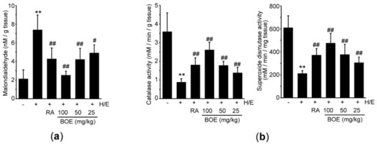 To investigate whether BOE prevents H/E-mediated tissue damage by reducing oxidative stress, malondialdehyde (a marker of lipid peroxidation) level was measured using the gastric tissue homogenate. Compared to vehicle, H/E significantly increased the level of malondialdehyde. All three different doses of BOE significantly decreased the malondialdehyde level, relative to the H/E group (Figure 7a), and the reduction in malondialdehyde by 100 mg/kg BOE was more potent than that seen in response to RA (p < 0.05). Next, we explored the effects of BOE on antioxidant activity in H/E-treated mice. H/E significantly inhibited catalase and superoxide dismutase activities. All three doses of BOE as well as RA significantly alleviated the reduction in catalase and superoxide dismutase activities (Figure 7b). There were no differences between the group treated with H/E + BOE and H/E + RA, except for catalase activity, which the magnitude of restorative effect by 100 mg/kg BOE was greater than that seen by RA (p < 0.01).