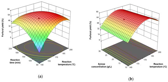 A three-dimensional (3D) plot and detailed contour of the RSM for furfural yield was established using Equation (3), by varying the three variables within the experimental range (Figure 1). As shown in Figure 1a, the furfural yield increased with reaction temperature and time to approximately 185 °C and 180 min, respectively. Once the temperature and time exceeded these points, there was a decrease in furfural yield due to its degradation under severe experimental conditions [26].