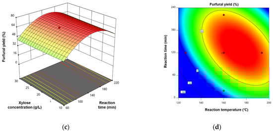 Three-dimensional plot and detailed contour of response surface methodology of furfural yield from xylose standard solution with extraction solvent (THF): (a) fixed xylose concentration (10 g/L); (b) fixed reaction time (120 min); (c) fixed reaction temperature (160 °C); (d) contour of furfural yield depending on reaction temperature and time.
