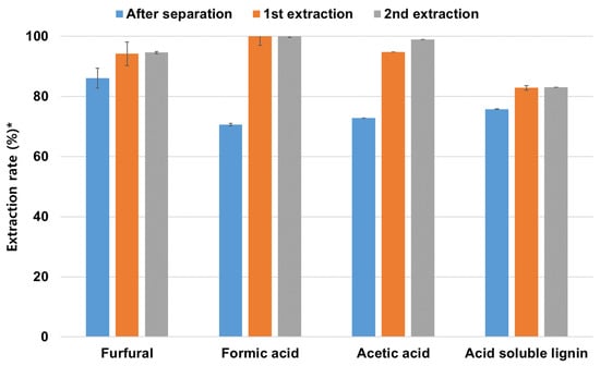 Figure 2 shows the increase in the furfural extraction rate to THF with the number of extractions. Following the second additional extraction, the extraction rate increased from 86.03% to 94.63%. However, impurities such as organic acids and ASL had also been further extracted as the number of extractions increased. In particular, organic acids such as formic acid and acetic acid were completely extracted to THF following the second extraction. This means that additional impurity separation is required to acquire furfural with higher purity. It was reported that organic acids and ASL may be separated from THF by the ion exchange resin [44,45], and absorbents such as activated carbon, respectively [46]. However, lignin separation by an absorbent must occur prior to furfural production, as the absorbent absorbs furfural and ASL through a π-π interaction [47].