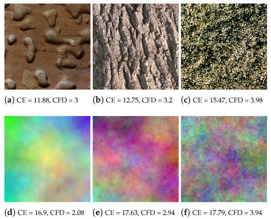 As mathematical measures for characterizing complexity, we use Color Entropy (CE) [,] and Color Fractal Dimension (CFD) []. The color space used was RGB, consistent with both natural and synthetic fractal texture images used in our experiments.
