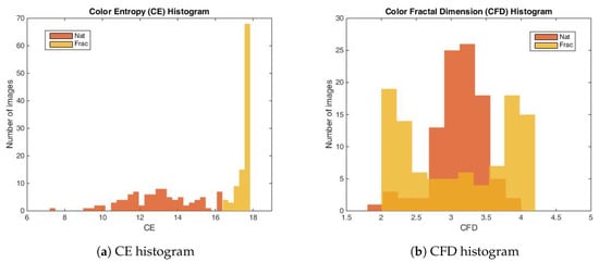 From the point of view of entropy, the synthetic color fractal images exhibit a larger complexity as compared to color natural images, however, considering color fractal dimension, their complexity is similar, between 1.89–3.98 for natural images and between 2.03–4.12 for fractal images. As observed in Figure 3b, their complexity distributions intersect for the majority of the images (91.84%).