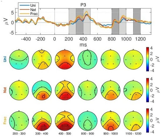 - a gradually increased amplitude already from the P200 (350 ms), as response to an increase in image complexity perception from Uni to Nat and Frac images perceptions, observed also spatially (see scalp plots in Figure 5) with increased activity in the parietal area (P3, P4 channels), highest for fractal images perception (3 V);