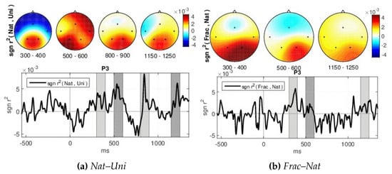 Moreover, the ERPs discriminations are highlighted by the signed measure, as shown in Figure 6 for channel P3, and class groups (Nat–Uni, Frac–Nat) where a value of zero of the signed indicates no correlation between the classes and a positive value indicates that the amplitude was larger for the first class in the group than for the second class and vice versa for negative values. We observe higher correlation over trials in time in the parietal area for Nat–Uni discriminability (Figure 6a) of up to within 300–400 ms, 800–900 ms, and 1150–1250 ms intervals, while for 500–600 ms the distribution is viewed across the entire brain (see scalp plots in Figure 6a). Similarly, the Frac–Nat discriminability in Figure 6b show higher parietal differences for the 300–400 ms, 500–600 ms, and 1150–1250 ms intervals. The signed differences are higher between Nat and Uni, compared to Frac and Nat images perceptions.
