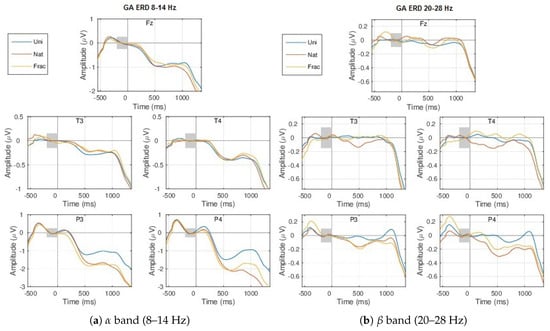 GA ERDs over all blocks, for the 3 types of images: Uni (blue), Nat (red), Frac (orange), considering all channels and the: (a) (8–14 Hz) and (b) (20–28 Hz) frequency bands. The shaded grey area marks the considered baseline period (−200,0) ms.