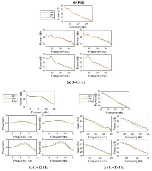 GA Power Spectrum over all blocks, for Uni (blue), Nat (red) and Frac images (orange), for all channels, on: (a) 3–40 Hz, (b) 5–12 Hz, (c) 15–35 Hz.