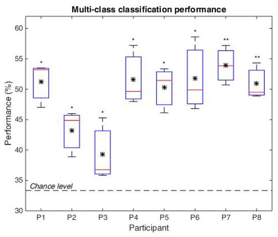 In Figure 9, the distribution of the classifier performance is presented for all participants and data folds, in form of box plots (where top and bottom box plot edges represent the 75 and 25 percentiles, whiskers show the min and max values, the median is indicated by the horizontal red line and the mean by the black asterisk). The statistical significance is represented above each box plot, where ‘**’ marks significance at 0.01 and ‘*’ at 0.05. The chance level of 33%, such as for 3 classes, is highlighted by the horizontal dotted line.