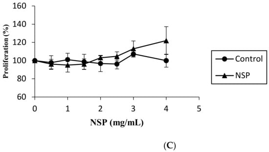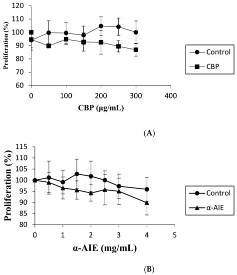 Figure 1. The cytotoxicity of CBP (A), α-AIE (B), and NSP (C). Cultures in basal medium served as control. Three independent experiments were performed, and the data were shown as mean ± SD. There is no significant difference between the experimental groups and the control group.