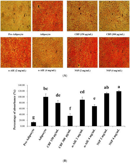 Figure 2. Effects of CBP, α-AIE, and NSP on lipid accumulation in 3T3-L1 cells. (A) Oil red O staining, and (B) Optical Density (O.D.) absorbance value. The data was expressed as mean ± SD. Different letters mean significantly difference (p < 0.05).