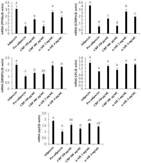 Figure 3. Effects of CBP and α-AIE on the mRNA expression level of peroxisome-proliferator-activated receptor families (PPARγ), CCAAT/enhancer binding protein (C/EBPα), sterol-regulatory element binding proteins 1 c (SREBP1c), lipoprotein lipase (LPL), and astragalus polysaccharides (ap2). The data were expressed as mean ± SD. Different letters mean significantly different (p < 0.05).