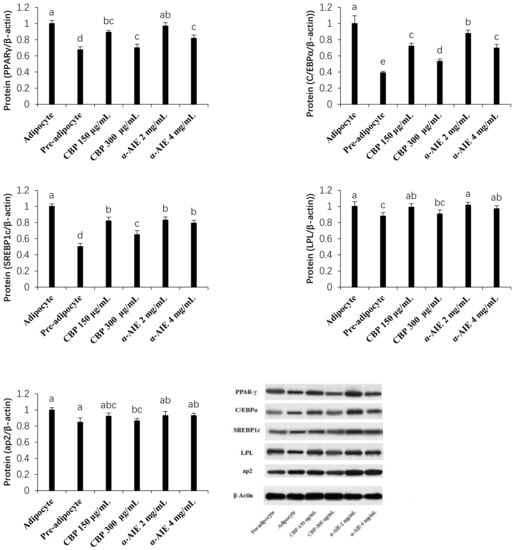 Figure 4. Effects of CBP and α-AIE on the protein expression level of PPARγ, C/EBPα, SREBP1c, LPL, and ap2. The data were expressed as mean ± SD. Different letters mean significantly different (p < 0.05).