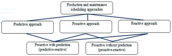 There are two proactive approaches: proactive without or with prediction (Figure 1). In the first approach, only the impact of a disturbance on the schedule using robustness measures is examined. Researchers search for the best sequence of idle times between production tasks or batches taking the advantage of the simulation process [,]. Considering only the relationship between production and maintenance tasks as a conflict in management decisions may cause unmet demand or unexpected machine failures. A common objective is to maximize a system productivity and efficiency. Usually, the time interval for maintenance task and the number of maintenance tasks are fixed in advance. The mentioned deficiencies of proactive-reactive approaches are eliminated in predictive-reactive approaches.