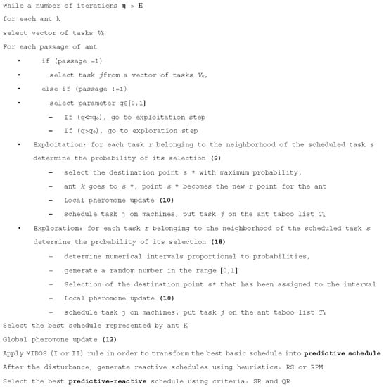 Pheromone and heurisitic information initialization is inspired by Boudjelida []. The same ant coding procedure was presented in [] as in this article. But the ACO algorithms differ in the procedure for improving the solution and the number of parameters controlling the intensity of the pheromone and the visibility of the pheromone. The main difference is also the approach to scheduling maintenance tasks. In this paper a predictive-reactive approach is considered, the author [] proposes a proactive-reactive approach. Both articles also consider different types of scheduling problems.