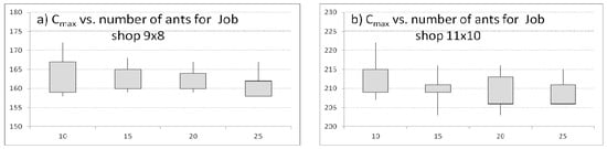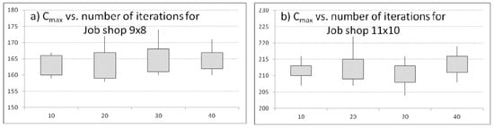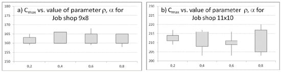 First, the influence of the number of iterations, E = {10, 20, 30, 40} over the quality of basic schedules generation for single criterion problem is investigated and for unchanging pheromone evaporation factor and number of ants K = {10}. The parameter q0 is equal to 0.5 to get an equal chance of choosing to explore and exploit by ants. By observing the first and third quartiles of Cmax and the best schedules achieved the following conclusion can be drawn that a larger number of iteration is, the higher chances of achieving a better solution are in scheduling problem (11 × 10) (Figure 3b). By observing the first and third quartiles of Cmax and the best schedules achieved for the scheduling problem (9 × 8), the opposite phenomenon can be observed. The smaller the number of iterations is, the greater the chances of achieving a better solution are (Figure 3a).