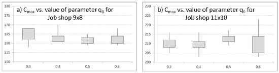 Then, the simulations are continued for the number of ants, K = {15}, iteration size, E = {20}, parameter and changing values of parameter q0 which decides abot exploration or exploatation selection by an ant, Observing average values of Cmax and the best schedules achieved (Figure 6) the following conclusion can be drawn that the lower values of parameter q0 are, the higer chances of achieving a better solution are. The average quality of population does not increase with the parameter values for scheduling problems (9 × 8) and (11 × 10) (Figure 6a,b).