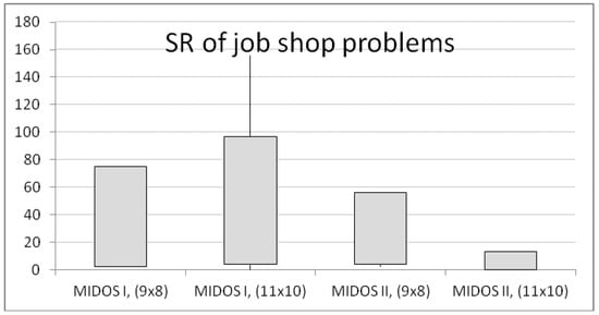 For example, in the first simulation, the predictive and reactive schedules were generated for the basic schedule obtained by the ACO and MIDOS I for the sequence of tasks: {7 8 6 9 5 2 4 3 1} for scheduling problem (9 × 8) and {10 8 7 6 11 9 3 4 1 5 2} for scheduling problem (11 × 10) (Table 1). The makespan function of the predictive schedule generated using the MIDOS I was Cmax(1) = 141. The makespan function of the reactive schedule generated using the MIROS was also Cmax(1*) = 141. The solution robustness was SR(1) = 48 and the quality robustness was QR(1) = 0 for the first scheduling problem (9 × 8). Quality of the task sequences achieved for the remaining ants for scheduling problems (9 × 8) and (11 × 10) is described in Table 1. Also, computer simulations were run for generating predictive schedules using the MIDOS II. Quality of the predictive and reactive schedules for scheduling problems (9 × 8) and (11 × 10) is described in Table 2. The average solution robustness of predictive schedules generated using the ACO and MIDOS I was 32.69 for scheduling problem (9 × 8) and 42.07 for scheduling problem (11 × 10) (Table 1). The average solution robustness of predictive schedules generated using the ACO and MIDOS II was 31.92 for scheduling problem (9 × 8) and 27.46 for scheduling problem (11 × 10) (Table 2). All achieved schedules are robust taking into account the quality robustness criterion for both scheduling problems (9 × 8) (Table 1) and (11 × 10) (Table 2). By analyzing the minimum, maximum, first quantile, third quantile and the mean values of solution and quality robustness, the following conclusion can be drawn: the MIDOS II heuristic is better to apply to the basic schedules generated by ACO (Figure 7).