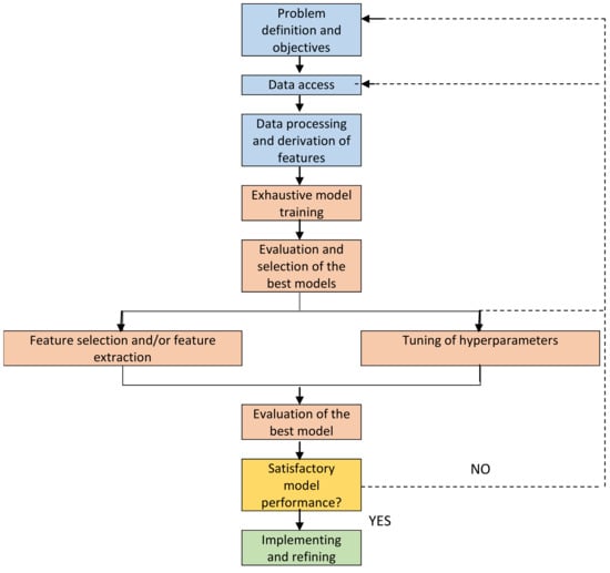 In the present work, the workflow presented in [], represented in Figure 1, will be followed. From our point of view, a Machine Learning project must always start with the establishment of rigorous and clear definition of the objectives, since such a system fulfills a very specific task and the definition of vague objectives can mean that the model developed is not able to predict exactly what it is intended to.