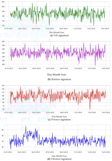 To better understand the behavior of each sensor, a simple statistical analysis is performed in Table 2, where the mean, the standard deviation, and the minimum and maximum values are calculated for the parameters voltage (“volt”), rotation (“rotate”), pressure (“pressure”) and vibration (“vibration”) during 2015. As an example, Figure 2 shows the graphical evolutions of the Tension signals (Figure 2a), Rotation (Figure 2b), Pressure (Figure 2c) and Vibration (Figure 2d), over the first fifteen days of January 2015, for machine 1 (machineID = 1).