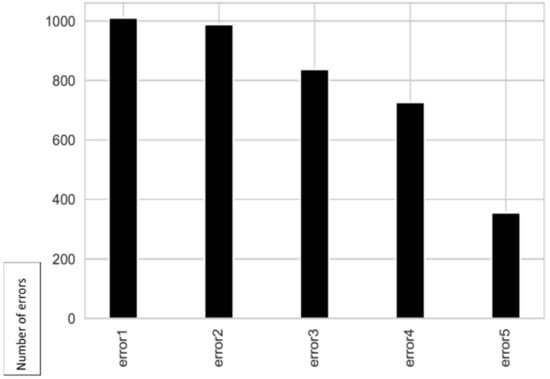 The second source of information is the error log. These are errors that did not immediately lead to a failure, as the machine remained operational. There are 5 types of errors: error1, error2, error3, error4, error5. The date and time are rounded to the nearest time. Each record consists of a date/time, machine and type of error—Table 3. The total number of error records over the year 2015 is 3919. In Figure 3 it is possible to observe the number of errors per type over the year 2015.