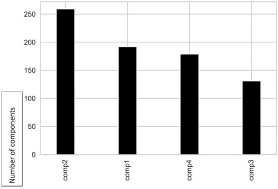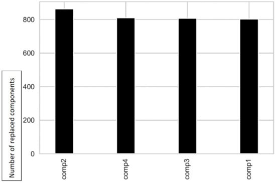 The maintenance records contain data of component replacements resulting from a scheduled or unscheduled maintenance intervention, periodic inspections, or performance degradation. In case of maintenance intervention due to the failure of a component, a fault record is also generated, see next paragraph. For each machine, this data set contains information about 4 types of components: comp1, comp2, comp3, comp4. The date and time are rounded to the nearest time. Each record consists of a date/time, machine and the type of component replaced—Table 4. The total number of maintenance records throughout 2015 is 3286. As previously mentioned, the maintenance records also contain entries for 2014. Figure 4 shows the number of components replaced, by type. It is possible to observe that in this case the number of substitutions is similar for the 4 types of components.
