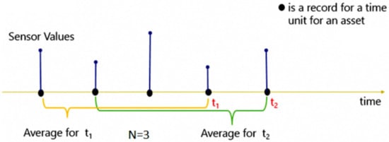For each record, a time window of dimension N is created and the lag features are calculated for the period N before the date/time of that record. Figure 7 shows an example of this application for a ti measurement with N = 3. The value of N is typically in minutes or hours, depending on the nature of the data.