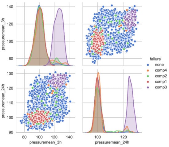 Thus, Figure 9 shows the failures, by type of components, according to the evolution of the features pressuremean_3h and pressuremean_24h. It is possible to observe that, for components 1 and 3, there are clusters of points.