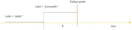 This process is illustrated in Figure 10. In order to achieve the reset from unstable to pre-unstable, observations within the time window (represented by “X” in Figure 9) before the occurrence of a failure have been labeled as pre-instable, while records outside this time interval X have been labeled as stable.