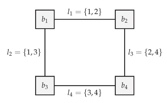 Complex network theory and graph-theoretic approaches have been used in the literature on cascading failures to study the power system, e.g., to identify critical components [29,30,31]. Protection system failures and misoperation have a propagating effect between components, and it is similarly necessary to consider the adjacency between them. The power system lends itself to a graph-based representation. A graph (G) is an object consisting of an ordered vertex set (V) and edge set (E) joining the vertices through its two connected buses u and v, as seen in (1)–(3), where n is the number of vertices in the graph and m is the number of edges in the graph, see e.g., [32,33]. Intuitively, it is natural to think of buses, b, as vertices and components such as transmission lines, l, as edges when it comes to representing the power system as a graph. An illustrative graph representation of a 4-bus power system following these conventions can be seen in Figure 1.