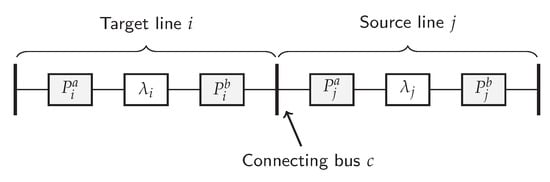 When including protection system failures into the system, we consider two different types of lines in each case: the target line i, for which we wish to calculate the failure rates, and the source line j, which is adjacent to the target line and contributes to the failure rate of the target line through propagation of protection system failures. The target- and source lines are adjacent lines if they are connected to a common bus, as seen in Figure 2. The subscript l is used when it is not specific if the line is a target or a source line.