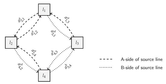 The primary concern is how misoperation of the protection system of one transmission line can cause an adjacent line to be isolated from the system. The system can initially be considered a graph G, where each edge represents a transmission line, and the buses are represented by vertices, which are unique observations of u and v. Let u represent the a-side connecting bus of a transmission line, and v the b-side connecting bus of the line. An adjacency matrix indicates connections between vertices and is used to represent the system in a form where vertices are transmission lines and edges are directed paths of failure propagation between the lines. An adjacency matrix is constructed for each side of the source line, in (4), to take into account which side of the source line is connected to the target line. The adjacency matrix is an ordered -matrix, where rows represent a target line i and columns represent a source line j. If line j is connected to line i through its s-side, it is marked with a digit 1 in the appropriate element of the matrix, 0 otherwise. Matrices are typeset in uppercase regular font, vectors are typeset in lowercase bold italic, while scalar values such as specific elements of vectors or matrices are typeset with italic fonts.