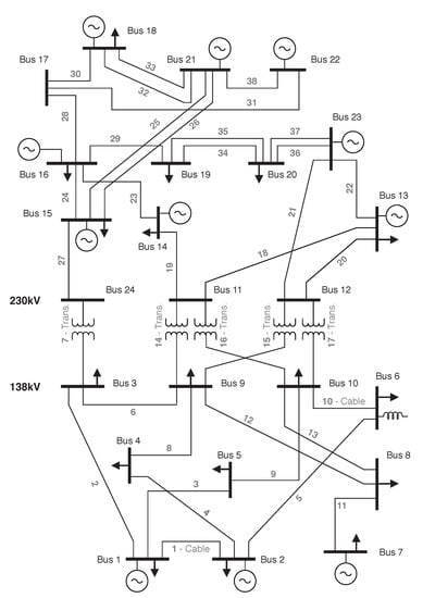 Twenty-four-bus Reliability Test System (RTS) [36] with component labels. Overhead transmission line unless otherwise noted.