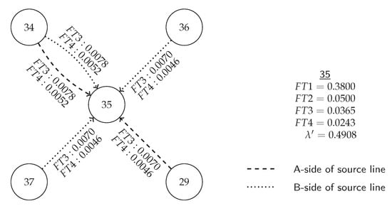 Adjacency matrices are created and weighted according to dependent probabilities and failure rates following the procedure in Section 3 to incorporate protection system reliability into the analysis. The results can be illustrated for the single line, branch 35, in Figure 5, where vertices are transmission lines and the directed edges show the adjacency between the lines. The line-style of the edges indicates the source line protection system side (A-side is dashed, B-side is dotted). To accumulate results, all edges leading into a vertex are summed up to see the contribution of FT3 and FT4 from the adjacent lines. Note the double connection between lines 34 and 35 appearing, causing line 34 to contribute to FT3 and FT4 at line 35 through two separate paths.