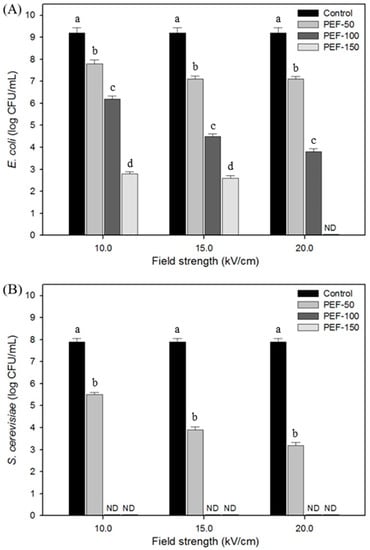 The inactivation of (A) Escherichia coli and (B) Saccharomyces cerevisiae inoculated in sterilized orange juice by pulsed electric field (PEF) treatments. PEF treatments were conducted at a field strength of 10, 15, and 20 kV/cm with different pulse frequencies, which resulted in PEF total specific energy inputs of 50 kJ/L (PEF-50), 100 kJ/L (PEF-100), and 150 kJ/L (PEF-150). ND, not detected.