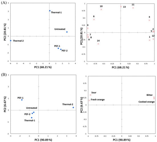 Principal component analyses (PCAs) of pulsed electric field (PEFs) and thermally treated orange juice. (A) PCA score plot with sample labeling and PCA loading plot with volatile compound codes. The compound codes are explained in Table 2. (B) PCA score plot with sample labeling and PCA loading plot with sensory attributes.