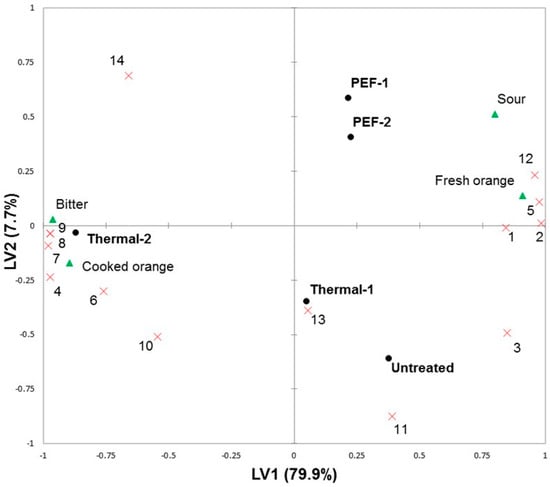PLS regression analyses were performed on the sensory attribute and volatile data (Figure 3). Latent vectors 1 and 2 (LV1 and LV2) explained 87.6% of the variation. Along LV1, there was a clear separation among the samples due to the treatments. The PEF-treated and weakly heated (i.e., Thermal-1) samples were more similar to the untreated sample on LV1 than the Thermal-2 orange juice. Untreated and PEF-treated samples were positively correlated with sour and fresh sensory attributes, which were associated with α-pinene (woody, pine, terpenic, herbal odor), dl-limonene (lemon, citrus-like, odor), β-cubebene (citrus, fruity odor), ethyl butyrate (sweet, fruity odor), and β-myrcene (green, metallic, balsam odor). However, the Thermal-2-treated orange juice sample was on the left side of the LVs and was correlated with bitter and cooked attributes, which were associated with the volatile compounds of α-phellandrene (turpentine, mint, spice odor), γ-terpinene (gasoline, turpentine odor), terpinolene (unpleasant, citrusy, chemical odor), β-terpineol (woody, pungent, earthy odor), and β-fenchyl alcohol (camphor odor).