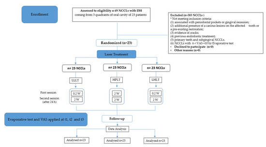 The three clinicians were recruited to perform the following functions: an enrollment of subjects affected by DH related to NCCLs, an evaluation of pain intensity per lesion after the evaporative test (ET), and the administration of the treatments in analysis. The researcher was trained to perform randomization to determine which NCCLs to treat with a diode laser. Lastly, the operator responsible for the enrollment of the subjects also carried out the analysis of the ET data.