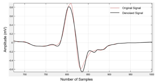 Soft thresholding provides smoother results than the hard thresholding method [25]. We used the Daubechies as the mother wavelet of order eight and decomposed the signals into four levels using a soft thresholding technique. The Daubechies wavelet of order 8 (db8) of the original and denoised ECG signal is shown in Figure 1.