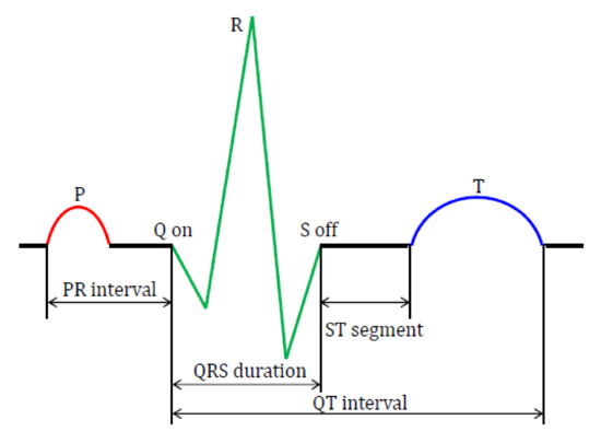 The ECG abnormalities can be detected using the features of the ECG signal, and it comprises the P-wave, time interval of the QRS complex (QRS) and T-wave, which includes the corresponding onset, offset and peak points and are represented as fiducial points, as shown in Figure 2 [28]. The features of an ECG signal are nothing but the segments and intervals between the fiducial points [29]. In this experiment, the fiducial points are detected based on the the Pan-Tompkins QRS detector and the corresponding intervals, such as RR-I (ms), heart rate (bpm), QRS complex (ms), time interval measured from the beginning of the P wave to the peak of the R wave (PRQ) in ms, amplitude of the R wave (R-H) in mV, amplitude of the P wave (P-H) in mV, time interval measured after the S wave to the beginning of the T wave (ST) in ms, time interval measured from the beginning of the Q wave to the end of the T wave (QT) in ms and corrected QT interval (QTc) in ms from the ECG signals extracted using BIOPAC Acqknowledge 5.0 software (BIOPAC systems Inc., Goleta, CA, USA).