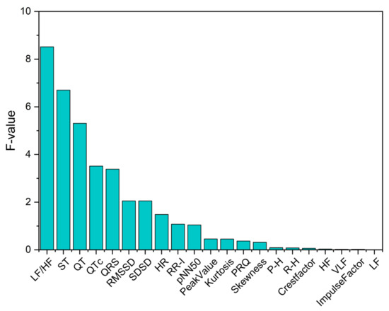 Feature selection approaches reduce the dimensionality of data by choosing a subset of predictor variables. It also enables the machine-learning algorithms to train faster and improves the accuracy of the model with the selection of the right subset. The feature selection techniques are further classified into the filter, wrapper and embedded methods [30]. The main challenge is the redundancy of the features, and the existing dimensionality reduction technique such as principal component analysis (PCA) is not suitable to build the applicable and human understandable models [31]. The filter-based feature selection approaches are investigated and found to be effective in selecting the features that are associated with stroke [32]. In this research, we applied one of the filter-based feature selection approaches, such as ANOVA, to select the optimal feature subset. The computational speed of the filter methods are much faster than the wrapper methods. ANOVA is a statistical test useful in comparing two or more mean values. For each feature, if the p-value is near to 0, there exists significant differences in the characteristic values for the different categories [33]. Feature importance ranking from the results of the ANOVA F-test are shown in Figure 3. Features that did not achieve sufficient significance (p ≥ 0.05) are omitted. Therefore, we selected three features such as LF/HF, ST and QT that showed statistical significance (p < 0.05) and are the highly ranked features. The correlation analysis was then performed to find the relation between these three features. The correlation coefficient r = −0.16 between LF/HF and QT indicates a weak negative correlation and reveals the inverse relationship between LF/HF and QT. Similarly, the correlation coefficient r = −0.19 between LF/HF and ST represents a weak negative correlation. Further, the ST and QT intervals indicate a moderate positive correlation of r = 0.44. As there are no strong correlations between these features, we selected LF/HF, ST and QT as the input features subset for the classification models.