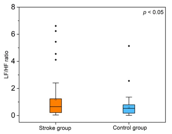 Boxplot representation of the low-frequency/high-frequency (LF/HF) ratio from the heart rate variability (HRV) spectral domain analysis (p < 0.05 between the groups).