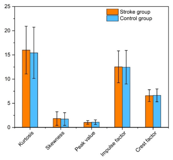 The statistical metrics such as kurtosis and skew were slightly higher in the stroke group, with no significant differences (p > 0.05). The peak value was slightly lower in the subjects with strokes, 1.05 ± 0.37 vs. 1.10 ± 0.47 in the controls. The impulsive metrics analysis revealed that the impulse factor was higher, whereas the crest factor was lower in the stroke group given in Table 3. Figure 5 illustrates the mean and standard deviation values of the variables between the groups.