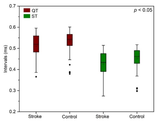 Boxplot illustration of the distribution of QT (p = 0.029) and ST intervals (p = 0.014) between the stroke and the control subjects.