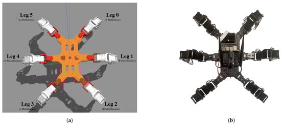 The PhantomX hexapod is comprised of 18 joints: six kinematically identical limbs with three joints each. The robot exhibits sagittal symmetry, with each symmetrical half consisting of three legs. These legs are denoted the prothoracic, mesothoracic and metathoracic. In this work they are enumerated as Legs 0–5, as depicted in Figure 1a.