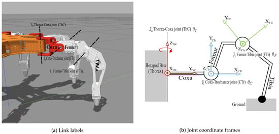 Hexapod leg links and coordinate frames (a) links and joint axes labeled on simulation (b) joint coordinate frames for each leg.
