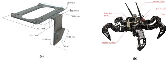 Hexapod physical augmentations and peripherals (a) CAD rendering of physical mounts for peripherals (b) modified PhantomX platform with Jetson Nano controller, Raspberry Pi Camera V2, buck convereter, U2D2, and Netis AC wireless adapter.